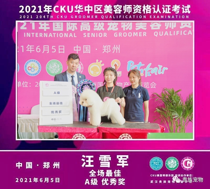 武漢貴族寵物美容培訓(xùn)學(xué)校優(yōu)秀學(xué)員汪雪軍同學(xué)榮獲2021年CKU美容認(rèn)證考試A級(jí)特別優(yōu)秀獎(jiǎng)及全場(chǎng)最佳